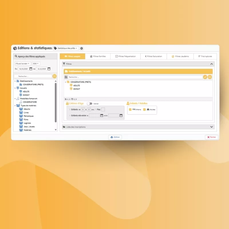 Fréquentation, statistiques sur les abonnés, les prêts, les réservations : Jeudemo produit vos rapports d'activité détaillés sans retraitement. Des données précieuses pour valoriser votre service auprès des élus et des financeurs.