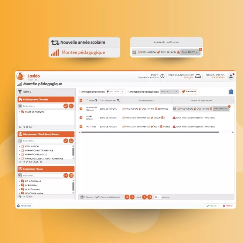 En fin d'année, Lasido génère automatiquement les ré-inscriptions sur la nouvelle année scolaire en gérant les montées de niveaux selon le cursus de chaque élève. Ce qui prenait des heures de saisie manuelle se fait en quelques clics.