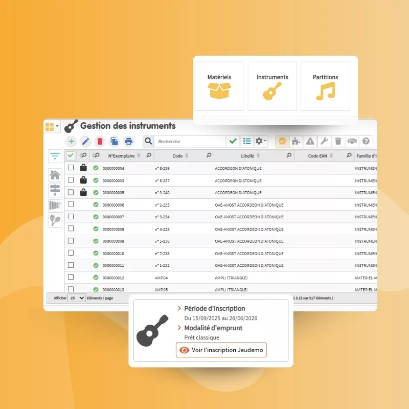 Lasido intègre une gestion complète du parc instrumental : fiche par instrument (âge, état, prix d'achat, marque), suivi des prêts passés et en cours, disponibilité en temps réel. La facturation des prestations de prêt aux familles est paramétrée selon vos règles.