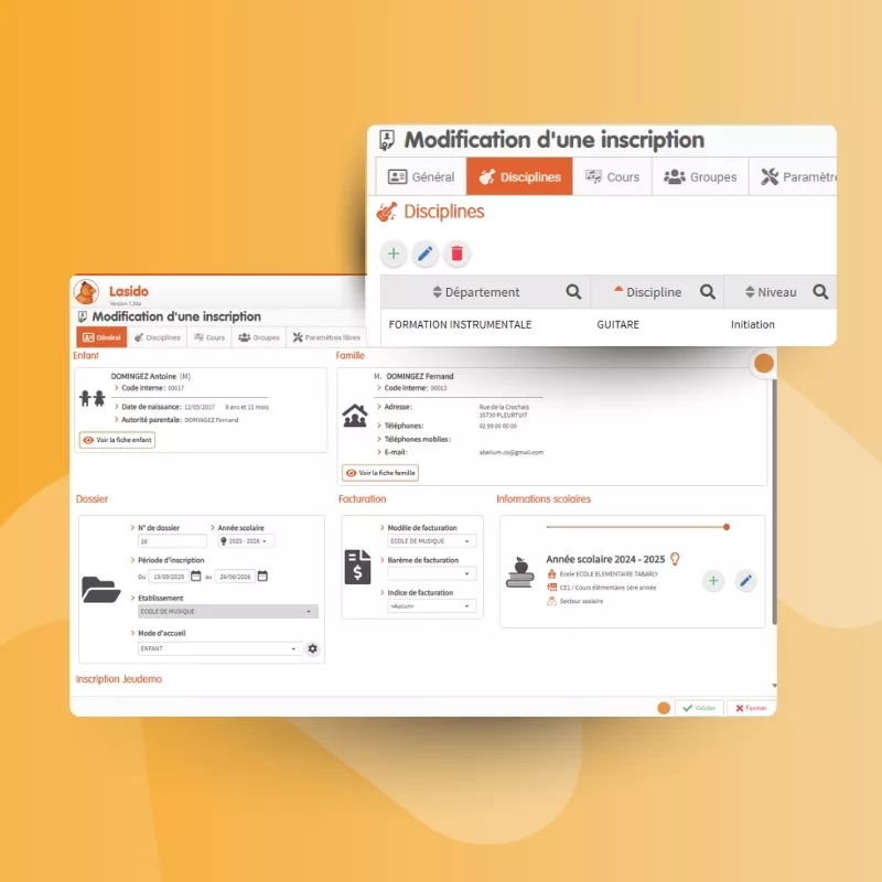 Lasido suit chaque élève de sa première demande d'inscription jusqu'aux examens de fin de cycle. Disciplines, cursus, niveaux, cours collectifs et individuels, planning, facturation, évaluations, tout est centralisé dans un dossier unique. L'historique est conservé d'une année sur l'autre, sans rupture.