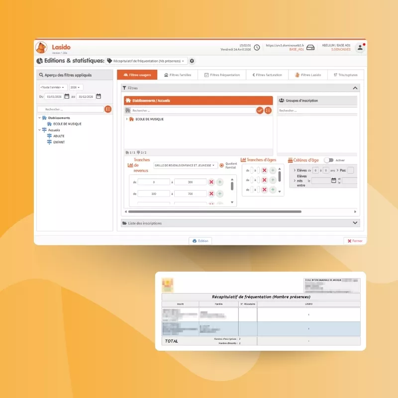 Décompte des inscrits par établissement, par discipline, par ville, répartition par cursus et par cycle : Lasido produit vos rapports statistiques détaillés sans retraitement. Des données précieuses pour vos bilans d'activité et vos demandes de subvention.