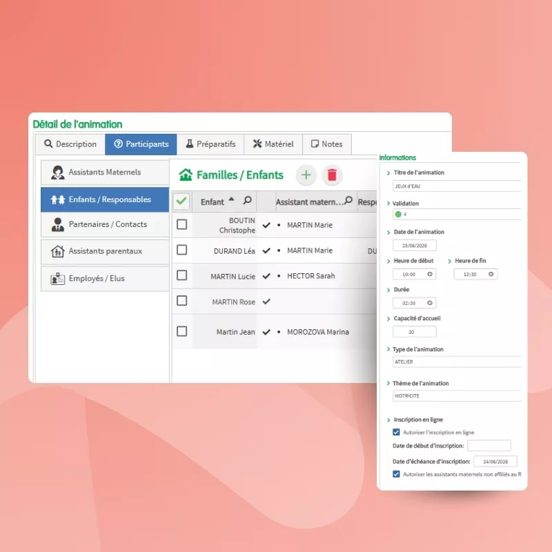 Créez vos animations et réunions, définissez les capacités d'accueil, gérez les inscriptions avec alerte automatique en cas de dépassement. Les assistants maternels s'inscrivent directement depuis le Portail Familles, sur leur smartphone ou ordinateur.